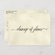 Esta hermosa postal de color marfil es una forma sencilla y sofisticada de hacer saber a sus invitados si tiene que alterar o posponer sus planes de boda. La parte delantera dice "cambio de planes" en elegante caligrafía, y la parte trasera tiene espacio para una nota personalizada donde puede explicar la situación a sus invitados. El diseño está hecho para bodas, pero es lo suficientemente versátil como para ser utilizado para cualquier evento o celebración.