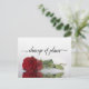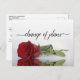 Esta hermosa postal es una forma elegante y sofisticada de informar a sus invitados si se encuentran en la desafortunada posición de tener que alterar o posponer sus planes de boda. La parte frontal presenta una hermosa fotografía de una sola rosa roja que se refleja en un estanque con olas y rizos, con caligrafía script que dice "cambio de planes". La parte trasera tiene espacio para una nota personalizada donde puede explicar la situación a sus invitados.