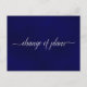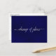 Esta hermosa postal está diseñada para mantener a sus invitados informados si necesita cancelar, alterar o posponer sus planes de boda. Cuenta con un diseño simple pero elegante con el texto "cambio de planes" escrito en caligrafía sobre un fondo azul marino marmolado. La parte posterior es una nota personalizada donde puede explicar todos los detalles a sus invitados. Aunque está diseñada para bodas, esta tarjeta es lo suficientemente versátil como para ser utilizada para cualquier evento o celebración.