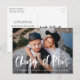 Tarjetas postales de cambio de planes elegantes y modernas que muestran tu foto de compromiso horizontal favorita con "Cambio de planes" en una superposición de letra de pincel moderna y blanca. Personaliza el anverso de la tarjeta de cambio de planes de foto agregando tus nombres y el texto de aplazamiento de la boda. El reverso de la postal incluye tu dirección de devolución, nombres, sitio web de la boda, etc.