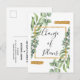 Comparta el cambio de planes con amigos y familiares cuando envíe este moderno anuncio de cambio de planes de boda pospuesta botánico. Este diseño presenta un marco dorado con follaje botánico verde y el texto "Guarde la fecha" en la parte frontal. En la parte posterior, personalice este producto con sus nombres y la fecha y ubicación de su boda.