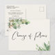 Si las circunstancias requieren que reduzcas la asistencia a tu boda, puedes informar a tu lista de invitados original con esta hermosa y moderna tarjeta postal de boda reducida de color crema claro que presenta suaves acuarelas de follaje de eucalipto verde claro con acentos dorados y "Cambio de planes" escrito en un estilo elegante en la parte frontal. En el reverso puedes personalizar fácilmente el mensaje de reducción de la boda con más detalle y agregar cualquier transmisión en vivo de la ceremonia, celebraciones futuras e información del sitio web de la boda.