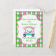 Un encantador carrito de golf rosa que está decorado para un cumpleaños con un borde de argyle verde y rosa de golf.