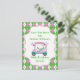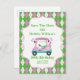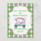 Un lindo carro de golf rosa que está decorado para un cumpleaños con un borde de argyle verde y rosa.