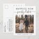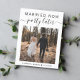 Anuncio de elopamiento moderno o tarjeta postal de anuncio de boda pequeña para informar a familiares y amigos que los planes de boda han cambiado, lo que requiere que se fuguen o reduzcan el número de invitados a la boda a un pequeño grupo íntimo, pero que organizarán una fiesta de celebración en el futuro. La parte delantera presenta su foto y "Casados ahora, fiesta más tarde" en una mezcla de tipografía simple y letra de moda. Debajo de tu foto puedes agregar tus nombres y la fecha de la boda. En el reverso puedes personalizar tu mensaje con más detalle y tus nombres con una letra similar a una firma.