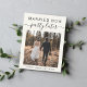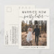 Anuncio de boda moderna o tarjeta postal para informar a familiares y amigos que los planes de boda han cambiado, requiriendo que se fuguen o reduzcan el número de invitados a un pequeño grupo íntimo, pero que organizarán una fiesta de celebración en el futuro. La parte delantera presenta su foto y "Casados Ahora, Fiesta Después" en una mezcla de tipografía simple y letra de moda sobre un fondo de crema claro. Debajo de su foto puede agregar sus nombres y fecha de boda. En el reverso puede personalizar su mensaje con más detalle y sus nombres en una letra similar a una firma.