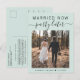 Tarjeta de anuncio de boda privada o fuga verde menta clara moderna para informar a familiares y amigos que los planes de boda han cambiado, requiriendo que se fuguen o reduzcan el número de invitados en su boda, pero que organizarán una recepción o fiesta de celebración en el futuro. La parte delantera presenta su foto y "Casados Ahora, Fiesta Después" en una mezcla de tipografía simple y letra de moda. Debajo de su foto puede agregar sus nombres y fecha de boda. En el reverso puede personalizar su mensaje con más detalle y sus nombres en una letra similar a una firma.