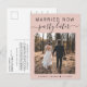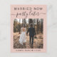 Anuncio de boda moderna o tarjeta postal para informar a familiares y amigos que los planes de boda han cambiado, requiriendo que se fuguen o reduzcan el número de invitados a un pequeño grupo íntimo, pero que organizarán una fiesta de celebración en el futuro. La parte delantera presenta su foto y "Casados Ahora, Fiesta Después" en una mezcla de tipografía simple y letra de moda sobre un fondo rosa suave. Debajo de su foto agregue sus nombres y fecha de boda. En el reverso puede personalizar su mensaje con más detalle y sus nombres en una letra similar a una firma.