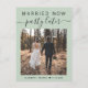 Anuncio de boda moderna o tarjeta postal para hacer saber a familiares y amigos que los planes de boda han cambiado, requiriendo que se fuguen o reduzcan el número de invitados a una pequeña reunión íntima, pero que organizarán una fiesta de celebración en el futuro. La parte delantera presenta su foto y "Casados Ahora, Fiesta Después" en una mezcla de tipografía simple y letra de moda sobre un fondo verde salvia. Debajo de su foto puede agregar sus nombres y fecha de boda. En el reverso puede personalizar su mensaje con más detalle y sus nombres en una letra con apariencia de firma.