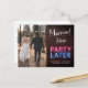 Anuncio de boda o elopamiento moderno y genial, o tarjeta postal para informar a familiares y amigos que los planes de su boda han cambiado, requiriendo que se fuguen o reduzcan el número de invitados en su boda, pero que organizarán una fiesta de celebración en el futuro. La parte frontal presenta su foto en un lado y "Casados Ahora" en letra cursiva blanca y "Fiesta Más Tarde" en tipografía roja y azul con un efecto de luces de neón brillantes contra un fondo de pared de ladrillos. En el reverso puede personalizar su mensaje con más detalle y sus nombres en una letra similar a una firma.