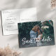 Una tarjeta postal moderna para guardar la fecha diseñada para acomodar tu foto de compromiso horizontal o horizontal favorita orientada a todo el paisaje. "Guardar la fecha" aparece cerca de la parte inferior de la foto en un estilo de tipografía de pincel escrito a mano, fresco e informal. Personalice con sus nombres, fecha de boda y ubicación de boda debajo. Las postales se invierten para mostrar detalles adicionales de guardar la fecha, incluido el sitio web del boda, con la dirección de devolución y el espacio para la dirección del destinatario.
