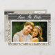 Chalkboard Burlap & Lace Photo Save the Date Cards - incluye un fondo de color con una banda impresa en timbre con la opción Save the Date en la parte superior. Save the Date está en un guión elegante para añadir decoración rústica o rural. Cambia la pareja de demostración a una imagen de tu elección.