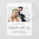 Chic anuncio de fuga o boda privada y tarjeta postal de recepción de boda después de la boda. En el frente aparece su foto en un marco de "Sr. y Sra.", "Celebre con nosotros" en una escritura moderna, y sus nombres, fecha y lugar de recepción en tipografía simple. En la parte posterior, personalice su anuncio de recepción de boda y firme sus nombres en una escritura similar a una firma.