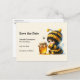 Guarda la postal de fecha con una imagen linda. Una chica con un traje de abeja crochet y una abeja a su lado. Viendo un frasco de miel.