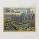 Tarjetas postales vintage de Chicago Save The Date con una vista del horizonte de la ciudad. Este diseño retro de mediados de siglo es la forma perfecta de reunir a los invitados en su boda de destino en Chicago, Illinois.