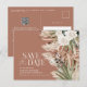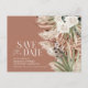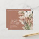 Tarjeta de invitación de postal de guardar la fecha de boda bohemia floral botánica rústica granja de granero moderno. Elegante floral acuarela en terracota, verde salvia, crema natural y tonos de color negro. Espacio en la parte posterior de esta tarjeta de guardar la fecha de boda económica para información y código QR para todos los detalles de su boda.