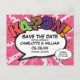 Personalice con sus nombres y detalles para anunciar la fecha de su evento especial. Diseño retro divertido y moderno con temática de arte pop de cómics, perfecto para bodas, fiestas de compromiso, baby showers, bautizos, fiestas de aniversario, celebraciones de aniversario, graduaciones, fiestas de cumpleaños y otros eventos especiales durante todo el año. Un diseño genial, trendy y divertido que pone el ¡boom! en su día. Diseñado por Thisisnotme©