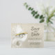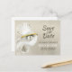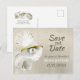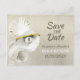 Nuestra tarjeta de Save the Date para boda en la playa muestra tres conchas marinas blancas y grises plateadas, incluyendo una concha de ostra con borde dorado y una perla brillante en su interior. El texto en la tarjeta está impreso en tonos de gris oscuro y blanco de concha, los colores de las conchas mismas. El fondo es un plateado perlado texturizado, perfecto para una apariencia playera o náutica. Los artículos coordinados incluyen una tarjeta plana de 5 x 7 (con sobre), una etiqueta de dirección de devolución y un sello redondo para sobre. Todo el texto se puede revisar fácilmente en la plantilla de personalización.