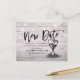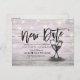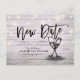 Tarjetas de anuncio de boda moderna con plantillas de tarjeta postal para aplazamiento - Letra elegante, copas de champán vintage y luces de cuerda sobre fondo de madera rústica.