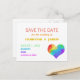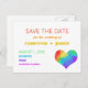 Tarjeta postal colorida y divertida de salva la fecha con un corazón de arcoíris y fuentes en colores de arcoíris sobre un fondo blanco.