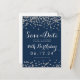 Diseño de plantilla de "Guardar la fecha" de cumpleaños 18 con confeti plateado brillante falso azul marino y texto personalizado de nombre y fecha. ¡Totalmente personalizable!