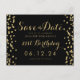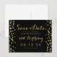 Plantilla de diseño de "Save The Date" para fiesta de 21 cumpleaños con texto de nombre y fecha personalizados y confeti negro brillante falso dorado. ¡Totalmente personalizable!