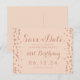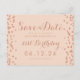 Plantilla de diseño de "Guardar la fecha" de cumpleaños 21 con confeti de purpurina falsa rosa dorada y texto de nombre y fecha personalizados. ¡Totalmente personalizable!
