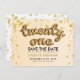 Elegante diseño de "Cumpleaños 21 Save The Date" con letras de globos dorados y confeti brillante, y nombre personalizado y texto de detalles. Impresiona a tu familia y amigos con este diseño elegante y glamuroso. Fácil de usar y personalizar. ¡Ordena hoy mismo!