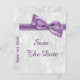 Tarjetas postales de aviso de fiesta de cumpleaños número 75 de mujeres para guardar la fecha. Tarjetas de aviso de cumpleaños número setenta y cinco de mujer para guardar la fecha. Hermoso fondo de patrón de damasco blanco con florituras y espirales con una imagen bonita y elegante de lazo y cinta de color púrpura / lila / lavanda romántico y con estilo. Estas tarjetas postales de aviso glamurosas, chic y clásicas son bellamente sofisticadas y están decoradas / impresas en ambos lados. POR FAVOR TOME NOTA: Todos los productos en Zazzle tienen imágenes impresas planas. Imágenes de lazo y cinta compradas a digital-designs-by-elena. Si necesita ayuda para personalizar su producto, por favor contácteme a través de mi tienda y estaré encantado de ayudar. También tengo otros productos coincidentes en mi tienda.