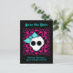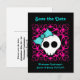 Super lindo punk gótico dulces 16 guardar la fecha postal con un fondo negro y fucsia y una calavera con un lazo azul. El texto es personalizable.