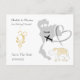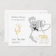 Tarjeta de aviso de boda de destino con estilo para parejas que se casan en Tailandia. Con motivos dorados inspirados en símbolos budistas, un mapa en silueta gris plateado y elefantes tailandeses blancos de la suerte. Muy bonito y fácil de personalizar con tus datos.
