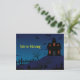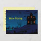 Un diseño divertido muestra una casa oscura con ventanas naranjas en una noche oscura. Murciélagos vuelan alrededor de la casa. El texto dice "Nos estamos mudando" y se puede personalizar, al igual que la nueva dirección y la información de contacto.