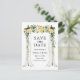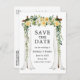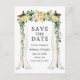 Elegante Dosel De Boda Acuarela Amarillo Blanco Floral Anuncio De Compromiso De Boda Tarjeta De Guardar La Fecha incluye hermosas rosas amarillas y blancas. El arco de dosel de boda de madera incluye vegetación botánica.