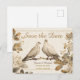 A sophisticated and serene digital illustration featuring a pair of cream-colored doves perched together on a rustic branch. The artwork is framed by delicate botanical elements, including leaves and blossoms adorned with shimmering gold leaf textures. Set against a subtly marbled off-white background with a slender gold border, this peaceful scene evokes themes of love, peace, and partnership. It is an ideal choice for Save the Date announcements.