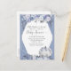 Disfruta de esta elegante y otoñal fiesta floral de baby shower para una bebé o un bebé. Azules, púrpuras y flores blancas con un fondo azul polvoriento. La calabaza se sienta en la parte inferior derecha. Plantillas proporcionadas tanto en la parte delantera como en la trasera. Plantilla de dirección de devolución en la parte trasera con otra calabaza y flores debajo de la calabaza.