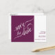 Estas tarjetas postales de "save the date" son simples, elegantes, modernas y con estilo. Presentan un diseño de 2 paneles con elegante caligrafía que dice "save the date" en el panel izquierdo de color púrpura cassis, magenta o bayas. El panel derecho es blanco y tiene espacio para sus nombres con la fecha y el lugar de la boda en una disposición única justificada a la derecha. Hay un espacio opcional para una URL de sitio web en el reverso donde sus invitados pueden obtener más información.