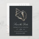 Notifique a los huéspedes de su próximo destino, playa o boda de islas tropicales con este hermoso verano, salve las postales de fecha con un falso ilustracion de concha de Relieve metalizado dorado sobre un suave fondo negro. Elegante guión blanco y letras en bloque muestran los detalles de su boda (nombres, fecha de boda y ubicación); utilice el reverso para compartir detalles adicionales como el sitio web de su boda. Las postales inversas para mostrar más detalles de guardar la fecha, incluyendo el sitio web de su boda, con su dirección de retorno y espacio para direccionamiento del destinatario, acentuado con dos conchas doradas adicionales.