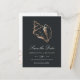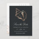Notifique a los huéspedes de su próximo destino, playa o boda de islas tropicales con este hermoso verano, salve las postales de fecha con un falso ilustracion de concha de Relieve metalizado de cobre sobre un suave fondo negro. Elegante guión blanco y letras en bloque muestran los detalles de su boda (nombres, fecha de boda y ubicación); utilice el reverso para compartir detalles adicionales como el sitio web de su boda. Las postales inversas para mostrar más detalles de guardar la fecha, incluyendo el sitio web de su boda, con su dirección de retorno y espacio para direccionamiento del destinatario, acentuado con dos conchas doradas adicionales.