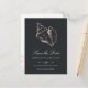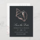 Notifique a los invitados de su próximo destino, boda en la playa o isla tropical con estas hermosas tarjetas postales de verano "save the date" que presentan una ilustración de concha de caracol con lámina de falso oro rosa sobre un rico fondo negro suave. La elegante letra script blanca y en bloque muestra los detalles de su boda (nombres, fecha de la boda y ubicación); use el reverso para compartir detalles adicionales como el sitio web de su boda.