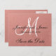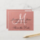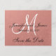 Elegante tarjeta postal Faux Rosa Dorado Holográfico y negro Guardar la Fecha. Elke Clarke© para MonogramGallery en Zazzle. Anuncio de boda moderno y simple con efecto de foto holográfica en rosa dorado. Una inicial de monograma blanca en tipografía script con texto negro superpuesto. Totalmente personalizable. Otros colores y efectos de fondo disponibles.