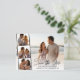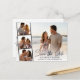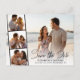 Tarjeta postal de anuncio de guardar la fecha elegante que incluye su foto superpuesta con una tira de película de tres fotos cuadradas más pequeñas y "Guardar la fecha" en un guión moderno y elegante. Agregue sus nombres, fecha de la boda y ubicación. En el reverso, personalice los detalles de guardar la fecha y agregue sus nombres en un guión con apariencia de firma.