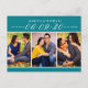 Estas elegantes bodas ahorran la fecha de las postales de la invitación incluyen tres fotos de compromiso de 2 x 3" con la fecha que aparece en escritura. Personalice el texto de la plantilla de la tarjeta en la parte delantera y trasera de la tarjeta postal para su gran día. El fondo verde/azul verde azulado y los colores de texto se pueden personalizar para coordinar con el esquema de color boda.