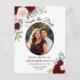 La postal Save the Date de esta boda rústica presenta un elegante diseño floral acuático con una foto en forma de oval rodeada de hermosos rosas pintados a mano en tonos rosa, rojo y borgoña. Fashionable, bohemio y moda, esta tarjeta es una excelente manera de hacer saber a tus amigos y familia para guardar la fecha de tu día especial.