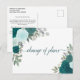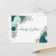 Esta hermosa tarjeta postal es una forma elegante y sofisticada de informar a sus invitados si está en la desafortunada posición de tener que alterar o posponer sus planes de boda. Cuenta con un diseño floral de acuarela pintado a mano con rosas y follaje en tonos de azul verdoso, turquesa, aqua y cian. La parte delantera dice "cambio de planes" en caligrafía elegante, y la parte posterior tiene espacio para una nota personalizada donde puede explicar la situación a sus invitados.
