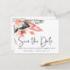 Elegantes hojas tropicales pintadas y arreglos florales coralinos, la boda salva la postal de la fecha. La tarjeta presenta una elegante caligrafía "Save the Date", en la parte delantera y trasera. Diseñado para coincidir con nuestra colección de trópicos modernos.