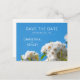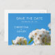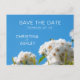 Hermoso boda floral "salva la fecha" con rosas blancas de ensueño y un cielo azul claro de verano.