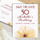 Celebra 50 increíbles años con esta elegante floral tarjeta Save the Date. Con una suave coloración de color amarillo y un diseño limpio y moderno, este diseño es perfecto para celebraciones de hitos, desde fiestas de jardines de moda hasta reuniones íntimas. Personalizable completo con los detalles de su evento. ¡Disfrútalo!