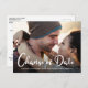 Aunque las circunstancias requieren que pospongas la fecha de tu boda, muestra a tus invitados que tu amor sigue adelante con tu fotografía de compromiso favorita en esta tarjeta postal de anuncio de cambio de fecha de boda. "Cambio de Fecha" está escrito en una gran letra blanca contemporánea en la parte inferior de tu foto, y debajo puedes personalizar tus nombres y si la boda se ha pospuesto, se ha cambiado el lugar, etc. En el reverso, puedes personalizar aún más tu mensaje con más detalle y agregar la nueva fecha y lugar de la boda.
