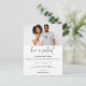 Para cuando las circunstancias significan que lamentablemente se ha vuelto necesario que cambien la fecha de su boda, una forma conveniente de informar a sus invitados sobre el cambio de planes y la nueva fecha lo antes posible. Este diseño moderno tiene su foto favorita de ambos en la parte superior y tipografía establecida El amor es paciente en una escritura moderna. El resto del texto en ambos lados se puede personalizar fácilmente.