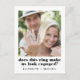 Un anuncio de tarjeta postal de compromiso fotográfico divertido que presenta una imagen de ustedes dos y su anillo de compromiso y "¿este anillo nos hace parecer comprometidos" en tipografía moderna y negrita. Agregue sus nombres y un mensaje personalizado, como espere la fecha de la boda o detalles para guardar la fecha.